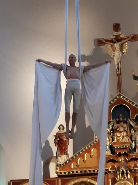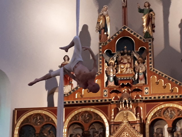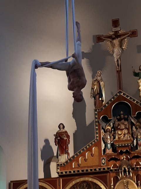 Eine weitere Besonderheit war auch noch die Predigt. Diese wird in dieser Gottesdienstreihe immer wieder durch Gastredner oder besondere Aufführungen gestaltet. Anlässlich des Jubiläums war der Artist Carismo alias Martin Bukovsek Teil des Gottesdienstes. Er zeigte am Vertikaltuch „Das tanzende Gebet“ und beeindruckte mit Akrobatik, Bewegung und Ästethik.