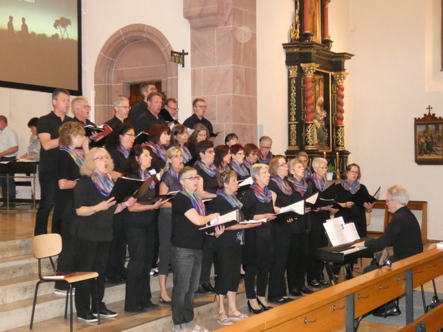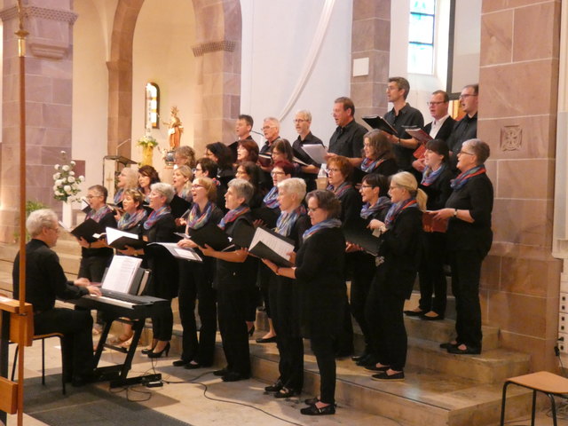 „Singt Lieder, die die Gemeinde mitsingen kann“ war die Vorgabe. Dass Kirchenmusiker und Chorleiter Bernhard Mussler die richtigen Stücke ausgewählt hatte, wurde schon zu Beginn des Gottesdienstes klar. „Die Gemeinde war so was von lebendig“ lobte Mussler die Besucher in der voll besetzten Kirche. Vom ersten Ton an sang die Gemeinde lautstark mit und trug den Chor auf einer Welle der Begeisterung. Die anfangs gewöhnungsbedürftige Akustik des Gotteshauses wurde dann zur Nebensache. „Man hatte das Gefühl, mehr Beschenkte zu sein als Schenkende“ zog Bernhard Mussler ein überaus positives Fazit über die Stimmung des Gottesdienstes.