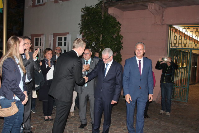 - Berghauptens neuer Bürgermeister Philipp Clever (mit Ehefrau Viktoria) mit zwei weiteren Kandidaten Gerhard Brüderle und Konrad Gaß (2. und 3. vorne rechts)