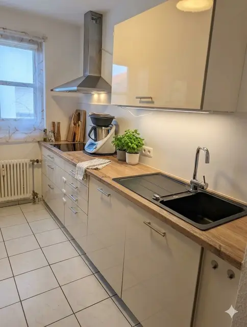 🍳 Küche: Eine Einbauküche ist vorhanden (ohne Kühlschrank und Spülmaschine). Diese muss vom Nachmieter für einen Abschlag von 1.500 € übernommen werden.