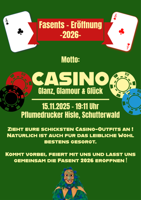 Liebe Närrinnen und Narren, Die NZ Pflumedrucker e.V. lädt euch herzlich ein zur Fasentseröffnung 2026. Datum: Samstag, 15. November 2025 Beginn: 19:11 Uhr Ort: Pflume Hisle, Schutterwald Motto: Casino Natürlich ist auch für das leibliche Wohl bestens gesorgt. Kommt vorbei, feiert mit uns und lasst uns gemeinsam die Fasent 2026 eröffnen! Wir freuen uns auf euch VUN-WÄÄGE NARRI-NARRO Eure Narrenzunft Pflumedrucker Schutterwald e.V. organisiert von der Jugend der NZ Pflumedrucker