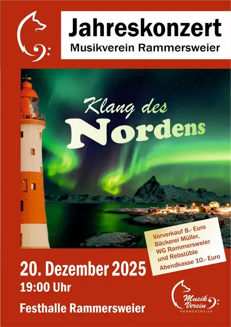 Bereit für eine musikalische Reise in den hohen Norden? Bei unserem diesjährigen Jahreskonzert unter dem Titel „Klang des Nordens“ trifft die klare nordische Klangwelt auf energievolle Blasmusik – frisch und überraschend. Freuen Sie sich auf ein abwechslungsreiches Programm, das Bilder von Fjorden, Polarlichtern und weiten Landschaften wach werden lässt. Erleben Sie einen Abend voller Emotionen und musikalischer Highlights – präsentiert von Ihrem Musikverein Rammersweier. Ein Abend, der...