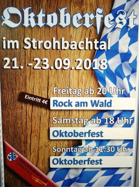 Das Oktoberfest der Trachtenkapelle Fußbach findet von Freitag den 21.09.2017 bis Sonntag den 23.09.2017 in Gengenbach - Strohbach statt. Gefeiert wird dabei auf dem Festgelände beim Naturerlebnisweg "Räuber Hotzenplotzpfad". An allen 3 Tagen werden Live Bands auf dem Festgelände aufspielen. Sowohl am Samstag als auch am Sonntag werden traditionelle Oktoberfest-spezialitäten von Original Oktoberfestbier über Weißwurst mit Brezel, Schweinshaxen oder Rettich mit Butterbrot geboten. Die Veranstaltungen finden in einem beheizten Festzelt statt.