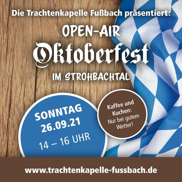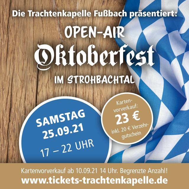 Das Oktoberfest der Trachtenkapelle Fußbach e. V. findet von Samstag 25.09.2021 in Gengenbach - Strohbach statt. Gefeiert wird dabei auf dem Festgelände beim Naturerlebnisweg "Räuber Hotzenplotzpfad". Am Samstag wird die Live-Partyband Doit auf dem Festgelände aufspielen und wie in den vergangenen Jahren für eine ausgelassene Oktoberfeststimmung sorgen.
