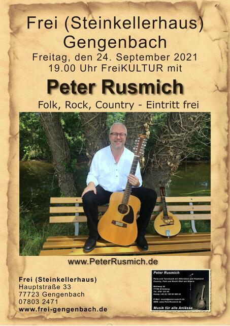Peter Rusmich interpretiert bekannte Lieder, aber auch selten gehörte Schätze aus 66 Jahren Folk-, Rock-, Pop- und Country-Musik. Er begleitet seinen Gesang mit der Akustik-Gitarre, Mandoline, Banjolele und Mundharmonika. Den Rhythmus spielt er live mit den Füßen.