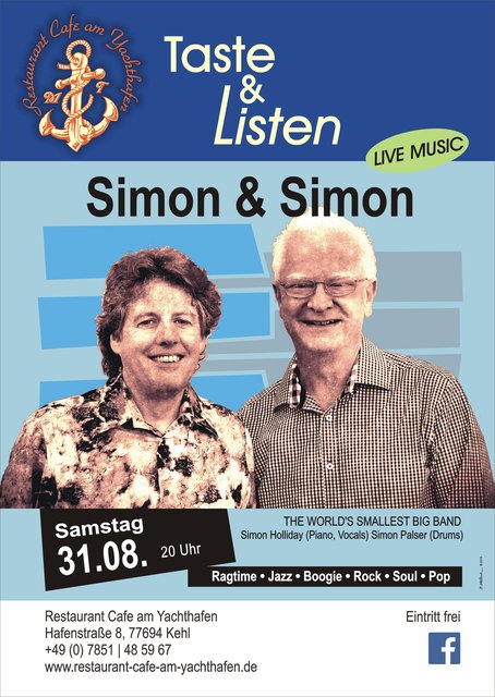 Wie selbstverständlich und begeisternd ein Engländer und ein Waliser mit diesem wohlschmeckenden und würzigen Südstaateneintopf, diesem „Gumbo“, umgehen können, beweisen am Samstag, 31.August 2019 in der Jazz Cantine des Kehler Restaurant Café am Yachthafen Simon Holliday (Klavier und Gesang) und Simon Palser (Schlagzeug) – Simon & Simon - „The Worlds Smallest Big Band.“
