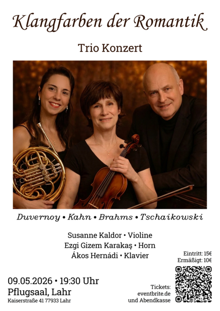 Ein unvergesslicher Kammermusikabend für Musikliebhaber! Erleben Sie am 9. Mai im Pflugsaal Lahr ein stimmungsvolles Trio-Konzert mit Werken von Duvernoy, Kahn, Brahms und Tschaikowski. Susanne Kaldor - Violine, Ezgi Gizem Karakaş - Horn und Ákos Hernádi - Klavier spielen in diesen unvergesslichen Kammermusikabend. In der besonderen Atmosphäre dieses Konzertsaals entfalten sich Klangfarben, die berühren und begeistern. Lassen Sie den Alltag hinter sich und genießen Sie einen Abend voller Musik...