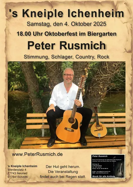 Beim Oktoberfest spielt Peter Rusmich Gitarre im Biergarten des Kneiple Ichenheim. Eintritt frei. Der Hut geht herum. Findet auch bei Regen statt, da alle Plätze überdacht.
