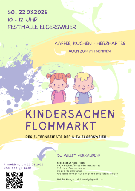 Am Sonntag, den 22.03.2026 findet von 10-12 Uhr wieder der Kindersachen Flohmarkt des Elternbeirats der KiTa Elgersweier in der Festhalle Elgersweier statt! Kommen Sie vorbei zum Verkaufen, Stöbern oder Kuchen essen. Wir freuen uns auf Sie!