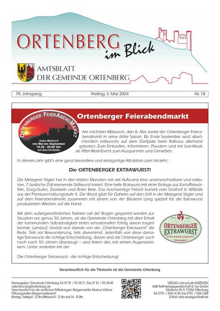 Am nächsten Mittwoch, den 8. Mai startet der Ortenberger FeierAbendmarkt in seine dritte Saison. Bis Ende September wird allwö-chentlich mittwochs auf dem Dorfplatz beim Rathaus allerhand geboten: Zum Einkaufen, Informieren, Plaudern und mit Live-Musik als After-Work-Event zum Ausspannen und Geniessen.