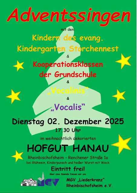 Gemeinsam mit den Kindern der Kooperationen mit dem Evangelischen Kindergarten Storchennest und der Grundschule Rheinbischofsheim werden der Schülerchor „Vocalinis“ und der Bischemer junge Chor „Vocalis“ das Adventssingen im weihnachtlich dekorierten Hof(gut) gestalten. Zum Ausklang wird Marianne Welsche mit der Gitarre bekannte Advents- und Weihnachtslieder anstimmen und zum Mitsingen einladen.