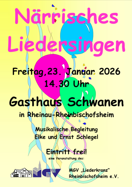 … „auf geht’s noch Bische, do isch ebbs los“ beim Närrischen Schlager- u. Volksliedersingen des MGV Liederkranz Rheinbischofsheim am Freitag den 23. Januar 2026 ab 14.30 Uhr im Gasthaus Schwanen. Für gute Laune und Stimmung sorgen wieder Elke und Ernst Schlegel.