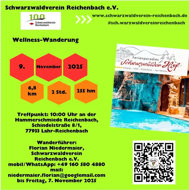 Wellness-Wanderung Sonntag, 9. November 2025 Treffpunkt: 10:00 Uhr an der Hammerschmiede Reichenbach, Schindelstraße 8/1, 77933 Lahr-Reichenbach Diese Aktivität kombiniert die zwei schönen Dinge Wandern und Wellness. Wir starten am Vereinsheim des Schwarzwaldverein Reichenbach e.V.: der Hammerschmiede. Von dort geht es vorbei an den Schindelhöfen über einen Jägerpfad zur Schindelwand. Nach wenigen Metern auf der Höhe geht es über einen weiteren Jägerpfad wieder talwärts nach Seelbach. Dort...