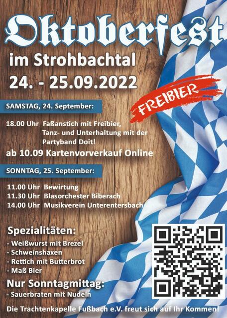 Oktoberfest in Gengenbach - Strohbach 20.09. - 22.09.2024 Das Oktoberfest der Trachtenkapelle Fußbach findet von Samstag den 20.09.2025 bis Montag den 22.09.2025 in Gengenbach - Strohbach statt. Gefeiert wird dabei auf dem Festgelände beim Naturerlebnisweg "Räuber Hotzenplotzpfad". An allen 3 Tagen werden Live Bands auf dem Festgelände aufspielen. Sowohl am Samstag als auch am Sonntag werden traditionelle Oktoberfest-spezialitäten von Bier im Maßkrug über Weißwurst mit Brezel, Fleischkäse oder...
