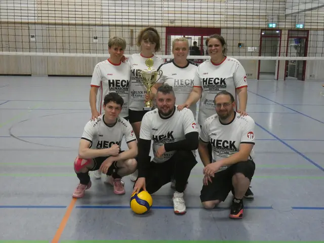 - Schirmherr Hans-Peter Pohl (von links), Amelie Hildbrand vom TV Steinach, Oliver Kiefer vom Sieger TuS Kinzigtal, Dominic Hertlein vom SC Hofstetten, Vorstandsvorsitzender Martin Heinzmann, Vorstand Oliver Broghammer