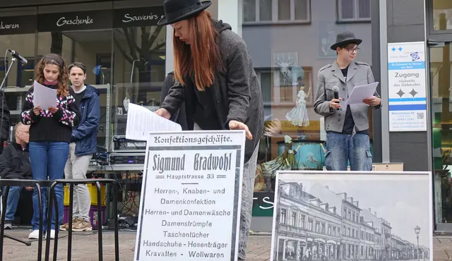 Was der politische und gesellschaftliche Umschwung in den 1930er-Jahren für eine jüdische Familie bedeutet, veranschaulichte die Zeitzeugen-AG des Einstein-Gymnasiums bei der Stolpersteinverlegung eindrücklich mit einer szenischen Lesung. Die Schüler schlüpften in die Rollen und Köpfe von Sigmund, Celine und Leo Gradwohl und machten so die um sich greifende Verzweiflung und das Gefühl, ausgeliefert zu sein, für die Besucher der Stolpersteinverlegung erlebbar. Immer wieder werden an passender Stelle Interviews mit tatsächlichen Zeitzeugen eingespielt, die sich an das Bekleidungsgeschäft Gradwohl, an den am 1. April 1933 ausgerufenen „Judenboykott“ und pöbelnde SA-Mitglieder vor der Ladentür erinnern.