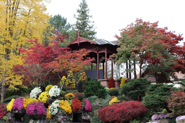 Ein wenig „Chrysanthema“ kann man im Lahrer Stadtpark genießen. „Mehr als 3000 Chrysanthemen-Büsche und zahlreiche Kaskaden schmücken in diesem Jahr die Parkanlage. Im Pavillon ist der Ozukuri zu bewundern, eine überdimensionale Chrysanthemen-Pflanzung mit Dutzenden Einzelblüten.“ So steht es in der Zeitung. Corona konnte die beliebte Chrysanthemen-Schau in Lahr nicht ganz verhindern. Im herbstlich gefärbten Stadtpark mit wunderschönen uralten Bäumen hat nun ein Teil der Chrysanthema einen würdigen Platz gefunden. Auch die Innenstadt zeigt an vielen Orten den beliebten Chrysanthemenschmuck.