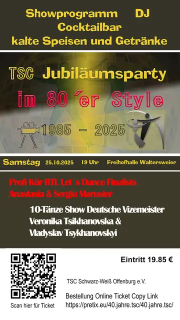 Einladung zur Jubiläumsparty des Tanzsportclub (TSC) Schwarz-Weiß Offenburg zum 40 jährigen Jubiläum (1985-2025) Am Samstag, den 25. Oktober 2025 findet eine Jubiläumsparty des Tanzsportclubs in der Freihofhalle Offenburg-Waltersweier statt. Beginn der Veranstaltung ist 19:00 Uhr. Die Party mit Showprogramm, DJ und Cocktailbar läuft unter dem Motto der 80er Jahre. Eintrittskarten können zum Preis von 19,85 Euro erworben werden. Die Bestellung der Eintrittskarten erfolgt online über das...