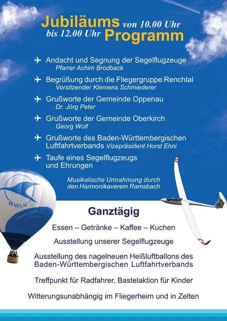 Die Feierlichkeiten beginnen mit einer kurzen Andacht und Segnung der Segelflugzeuge durch Pfarrer Achim Brodback. Es folgen Grußworte der Gemeinden Oppenau und Oberkirch, Ehrungen durch den Luftfahrtverband Baden-Württemberg (BWLV) und die Taufe eines Segelflugzeuges auf das frühere Ehrenmitglied „Karl Thoma“.