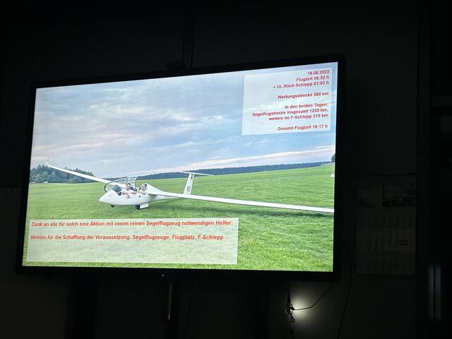 Im zweiten Teil des Nachmittags präsentierte Michael Buchthal den sensationellen Wandersegelflug mit Joachim Treier, welcher leider nicht am Event teilnehmen konnte. Joachim Treier war 1999 Deutscher Meister der Junioren in der Standardklasse. Die beiden erfahrenen Cracks flogen von Musbach bis nach St. Auban in der Provence und am zweiten Tag wieder zurück. Das exzellente Segelflugwetter Mitte August 2023 im Alpenrelief zeichnete sich seit Tagen ab. Im Schwarzwald gabs dagegen stabiles Hochdruckwetter, mit nur mäßiger Thermik. Deshalb entschieden sich die beiden Alpenflieger für einen längeren Flugzeugschlepp bis Oberstdorf im Allgäu um anschließend den Alpeneinstieg im Segelflug zu schaffen. So hatte auch der 2. Vorsitzende der Fliegergruppe Karl Pfau als Schlepppilot sein Erfolgserlebnis. Mit einem zweitägigen Wandersegelflug, der sie über fünf europäische Länder führte, eroberten die beiden erfahrenen Segelflieger die faszinierende Alpenwelt. Am ersten Tag wurde das Flugziel Provence wurde nach 8:22Stunden und 655 Segelflugkilometern erreicht.