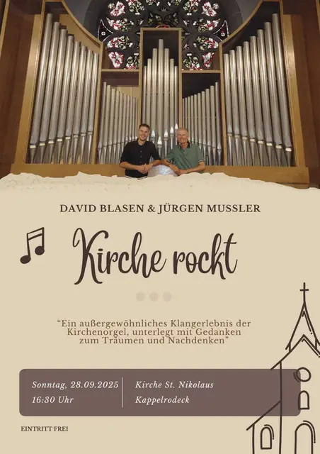Im Rahmen einer zentralen Veranstaltung der Erzdiözese Freiburg sind wir eingeladen, diesen Tag mit "Kirche rockt" ausklingen zu lassen. Außergewähnliche Orgelklänge von David Blasen, werden vom Simon Blasen am Schlagzeug und von Jona Blasen am Keyborad begleitet. Zu hören sind unter anderem The Best von Tina Turner, die New York Ouverture und die Welt voller Wunder von den Fäschtbänkler. Jürgen Mußler wird mit Gedanken zum Träumen und Nachdenken einladen, bevor die Klänge den Kirchenraum...