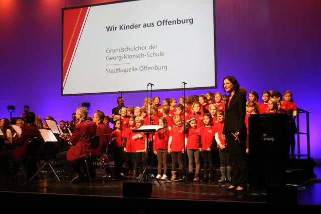 Damit zog er den Bogen zur Verleihung der Bürgermedaille der Stadt Offenburg, die in diesem Jahr dem Thema Partnerschaft in Europa gewidmet ist. Die ehrenamtlichen Vertreter aus Offenburg und seinen Partnerstädten Weiz, Lons-le-Saunier und Pietra Ligure, die sich aktiv für den Fortbestand dieser Partnerschaften einsetzen, wurden mit der Bürgermedaille ausgezeichnet. Nach einer mitreißenden Lasershow kamen die Ausgezeichneten selbst zu Wort und erzählten, wie sie teilweise als Jugendliche erstmals in die Partnerstadt gereist waren und was sie seitdem dort erlebt haben. Ausgezeichnet wurden Adelbert Metz, langjähriger Vorsitzender des Partnerschaftsverein "Die Brücke" aus Offenburg, Silvano Ferrua aus Pietra Ligure, Francoise Meynier aus Lons-le-Seunier und Engelbert Maier aus Weiz.