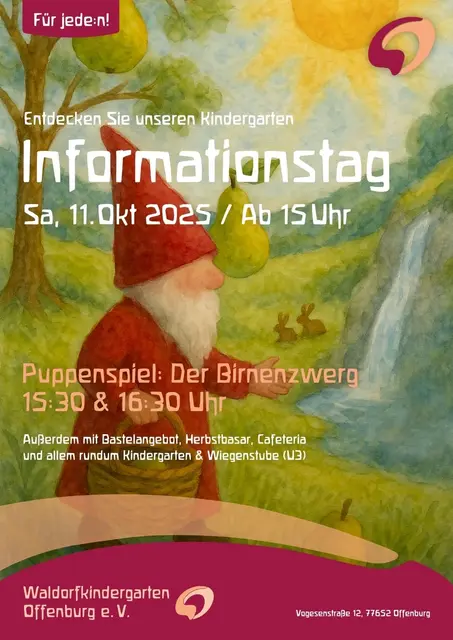 Der Waldorfkindergarten Offenburg e. V. öffnet am Samstag, 11. Oktober 2025, ab 15:00 Uhr seine Türen für interessierte Familien und lädt herzlich zum Informationstag ein.