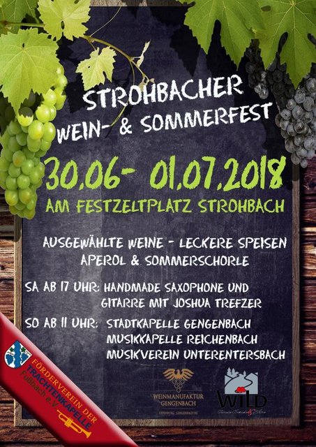 Strohbacher Wein- & Sommerfest 2018 Am Samstag 30. Juni und Sonntag 1. Juli findet das Strohbacher Wein- & Sommerfest statt. Kulinarische Köstlichkeiten, leckeres Essen und ausgewählte musikalische Unterhaltung gibt es am Samstag ab 17 Uhr und Sonntag ab 11 Uhr. Auf dem Wein- & Sommerfest präsentieren wir Ihnen erlesene Weine der Weinmanufaktur Gengenbach sowie dem Weingut Wild aus Strohbach. Am Samstagabend präsentieren wir Ihnen Solokünstler Joshua Trefzer mit seinem Saxophone und Gitarre und...