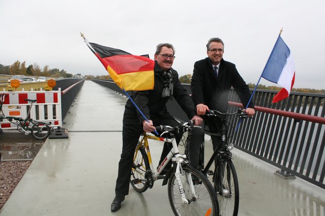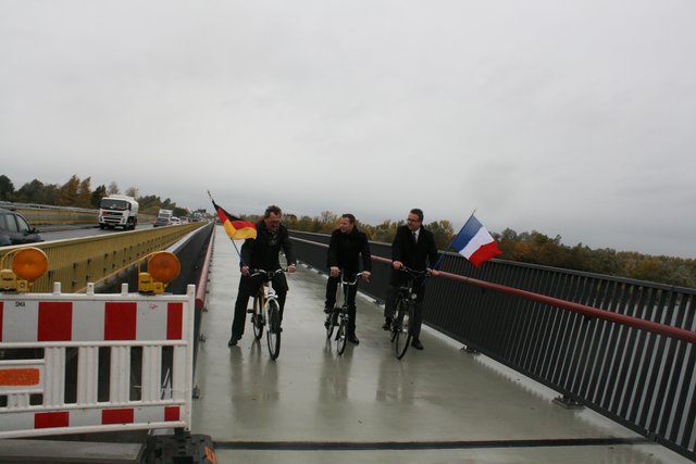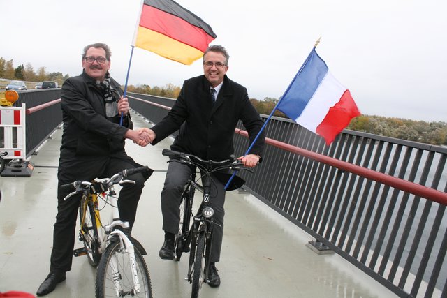 Das Gesamtprojekt für einen gesicherten Rheinübergang geht weiter. Das hierfür zuständige Département Bas-Rhin geht davon aus, dass die Geh- und Radwegbrücke über den Kraftwerkskanal Mitte 2019 fertiggestellt ist. Der Termin für die große Eröffnungsfeier des gesamten, durchgehenden Geh- und Radweges von und nach Frankreich steht fest: 23. Juni. "Es wird dazu große Überraschungen geben", kündigte Hoffmann an. Welsche und Hoffmann ließen es sich nicht nehmen, sich auf ihre mitgebrachten Fahrräder zu setzen und die 144 Meter Flaggen schwenkend zu befahren.