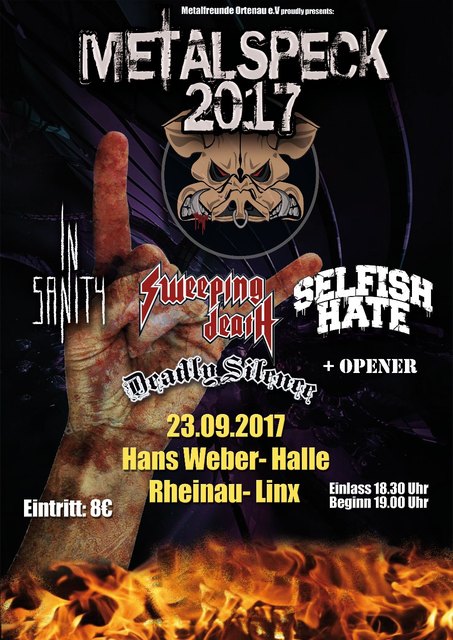 Metalspeckfestival 2017Und auch in der 5 Auflage haben wir wieder Hammerbands am Start:SWEEPING DEATH (Progressive Thrash) aus Bayernhttp://sweepingdeath.deIN SANITY (Melodic Death Metal) aus Paderbornhttp://insanitymetal.comSELFISH HATE (Hardcore) aus Freiburghttp://www.selfish-hate.comDEADLY SILENCE (Thrash/ Deathmetal) aus Gengenbachhttps://www.facebook.com/Deadly-Silence-106614849669693/+ Opener tbaEintritt: 8€Einlass 18.30Beginn 19.00Es gibt Einlasskontrollen! Personen unter 18 Jahren...