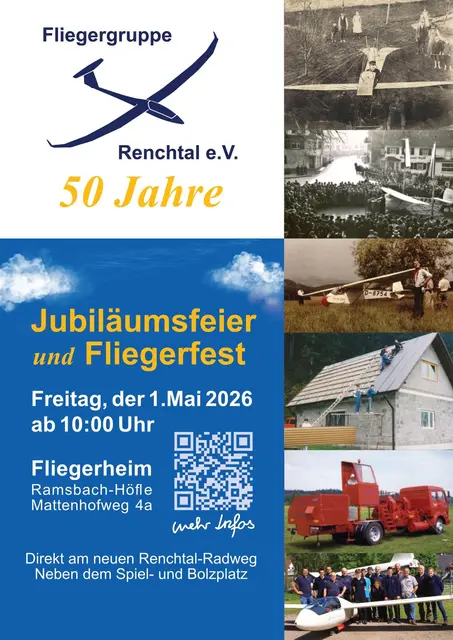 Die Fliegergruppe Renchtal e.V. lädt am 1.Mai zum alljährlichen Fliegerfest ins Fliegerheim nach Oppenau, Ramsbach-Höfle ein. Parallel findet ab 10:00Uhr bis Mittag auch die 50-Jahre Jubiläumsfeier statt. Die Feierlichkeiten beginnen mit einer kurzen Andacht und Segnung der Segelflugzeuge durch Pfarrer Achim Brodback. Es folgen Grußworte der Gemeinden Oppenau und Oberkirch, Ehrungen durch den Luftfahrtverband Baden-Württemberg (BWLV) und die Taufe eines Segelflugzeuges auf das frühere...