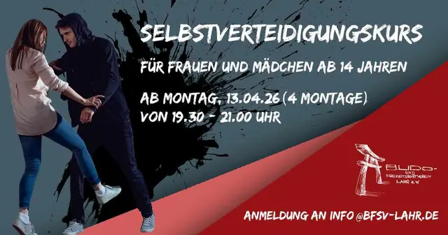 Mehr Sicherheit. Mehr Selbstvertrauen. Mehr innere Stärke. Kennst du das Gefühl, abends allein unterwegs zu sein und dich unwohl zu fühlen? Unsicherheit beginnt im Kopf – Selbstverteidigung gibt dir die Kontrolle zurück! Ab dem 13. April 2026 bietet das Selbstverteidigungsteam des BFSV Lahr e.V. einen speziellen Selbstbehauptungs- & Selbstverteidigungskurs für Mädchen und Frauen ab 14 Jahren an. In vier praxisnahen Einheiten lernst du, dich selbstbewusst zu behaupten und in Gefahrensituationen...