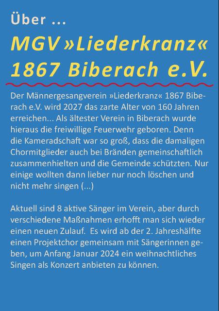 Veränderungen beim „Chor für Alle – Liederkranz Biberach e.V.“ - gemischter Chor startet den 14-tägigen regelmäßigen ProbenbetriebAm Mittwoch den 18. April 2024 fand im Gasthaus "Kinzigstrand" in Biberach die ordentliche Mitgliederversammlung des Vereins "Chor für Alle - Liederkranz Biberach e.V." statt. Es waren 17 Personen anwesend, darunter letztmalig als Bürgermeister-Stellvertreter Hans-Peter Fautz. Die Versammlung wurde mit dem Lied "Guten Abend, guten Abend" eröffnet. Vorsitzender Markus...