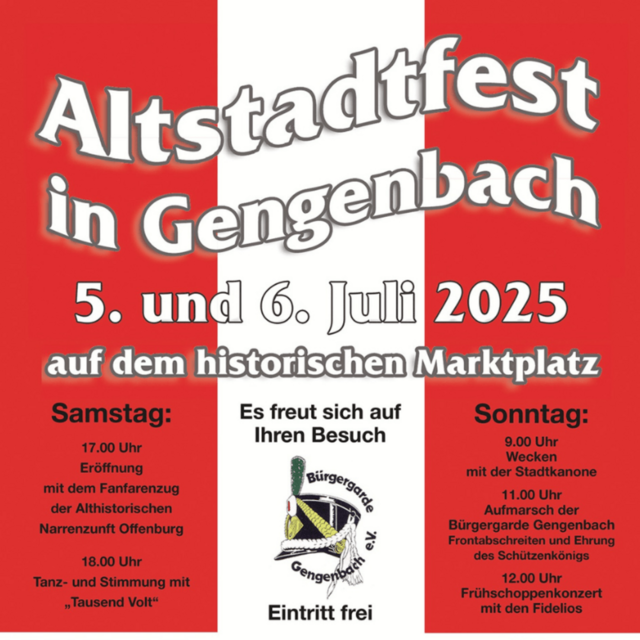 Am Wochenende dem 05. und 06. Juli 2025 veranstaltet die Bürgergarde Gengenbach ihr traditionelles Altstadtfest auf dem historischen Gengenbacher Marktplatz. Eröffnung der Veranstaltung ist am Samstag, 5. Juli, ab 17:00 Uhr mit dem Fanfarenzug der Althistorischen Narrenzunft Offenburg. Ab 18:00 Uhr sorgt die Band „Tausend Volt“ mit ihrem musikalischen Programm für Stimmung und es kann das Tanzbein kräftig geschwungen werden. Am Sonntag, dem 06.07. hallen ab 9:00 Uhr Kanonenschüsse der...